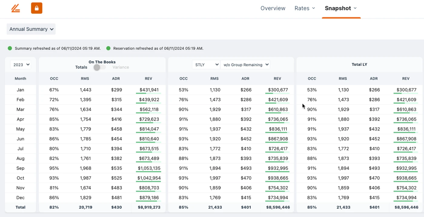 Historical performance data from Lighthouse Business Intelligence shows last year’s occupancy and rooms sold in a hotel